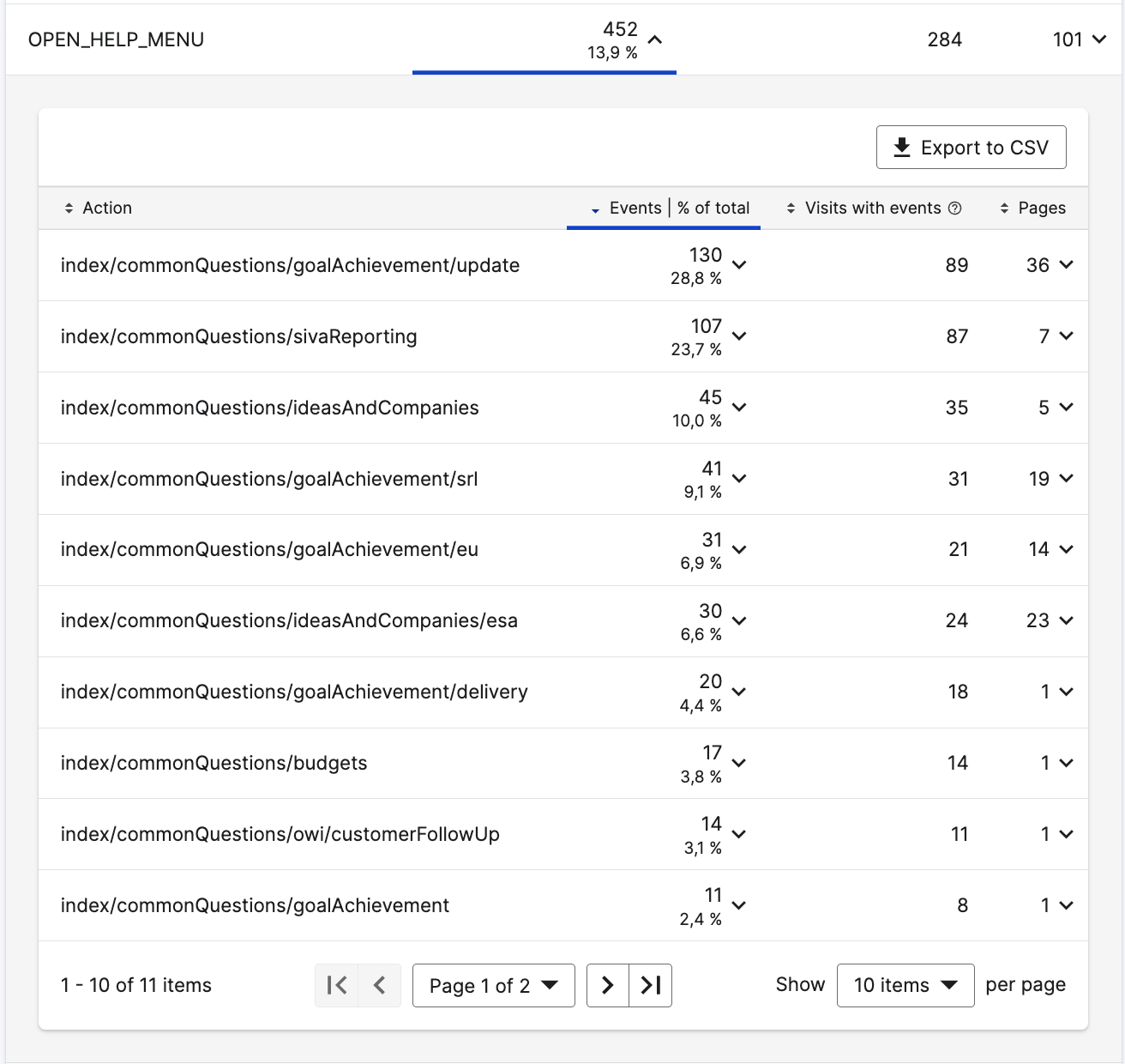 Page views for help side menu: the selected category is another part of the portal, Siva reporting FAQs